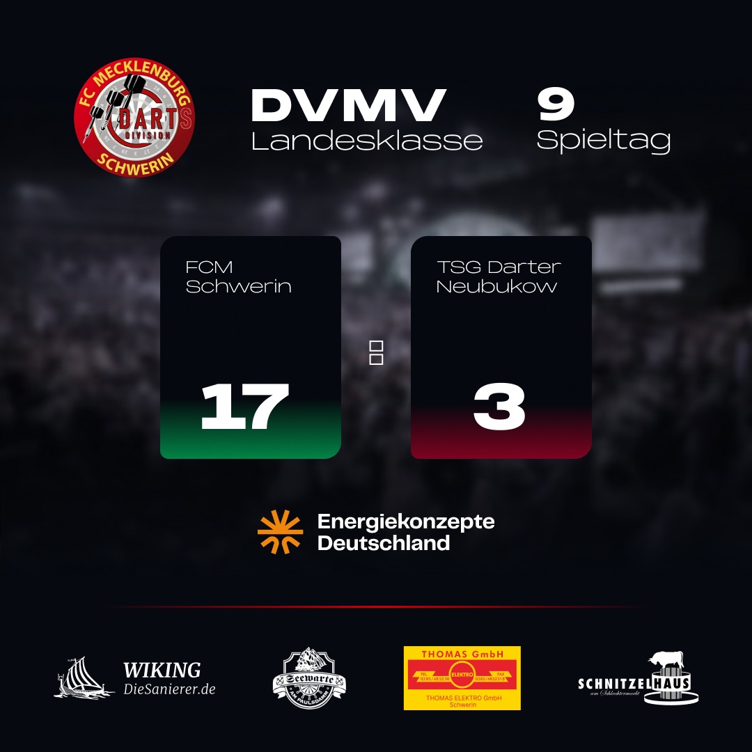 Bekanntlich macht sich das Konto am Monatsende bemerkbar – und genau deshalb wollten die Jungs der FCM Dart Division nach zuletzt zwei Niederlagen in Folge am 9. Spieltag der Landesklasse unbedingt wieder Zählbares einfahren. Zu Gast waren die TSG Darter aus Neubukow. Da unsere Gäste pünktlich angereist waren, konnten wir etwas früher starten. Von Beginn an legten wir ordentlich los und erspielten uns nach den ersten acht Einzelspielen eine solide 8:2-Führung. Für die Doppel hatte sich unser Teamkapitän etwas Besonderes überlegt: Kuno feierte sein Ligadebüt. Gemeinsam mit Sven ließ er nichts anbrennen – die beiden gewannen ihre beiden Spiele souverän. Was für ein Einstand! Auch in den darauffolgenden Begegnungen geriet der Sieg nie mehr in Gefahr, sodass die Feuerwehr an diesem Abend nicht mehr ausrücken musste. Mit einem klaren 17:3-Endstand sichern wir uns damit drei weitere Punkte und behaupten weiterhin den zweiten Tabellenplatz.