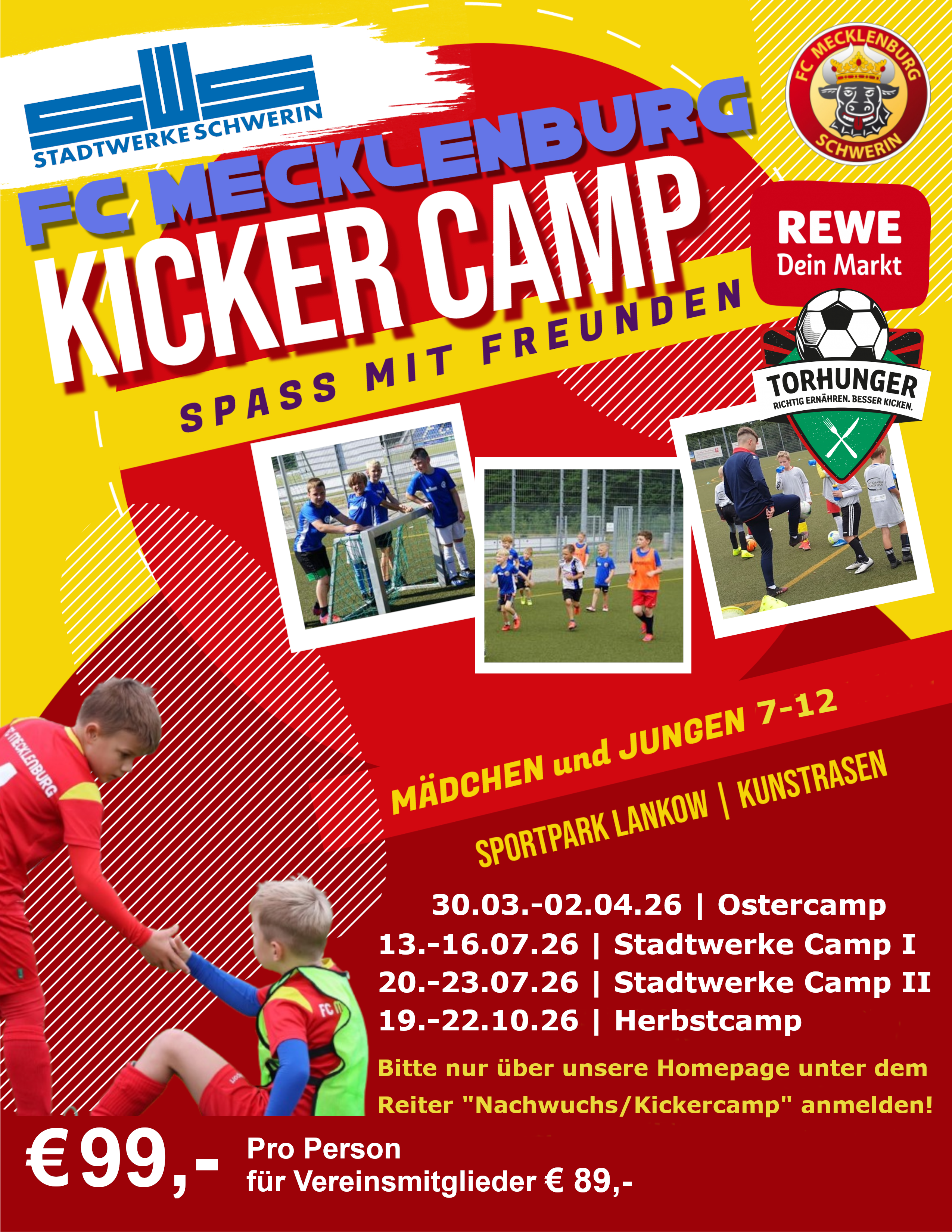 Auch im Jahr 2026 führt der FC Mecklenburg Schwerin seine traditionellen Kickercamps durch! Mit den Stadtwerken Schwerin als Hauptsponsor und der Initiative Torhunger von Rewe haben wir wieder starken Partner an unserer Seite. Torhunger – Richtig ernähren. Besser kicken. Unter diesem Motto verankert REWE mit der Initiative Torhunger in der Partnerschaft mit dem DFB die Bedeutung von gesunder Ernährung nachhaltig im deutschen Fußball – von den Nationalmannschaften bis in den Amateurbereich. Auf torhunger.de bietet REWE eine umfangreiche Plattform mit Tipps zur gesunden Ernährung. Der FC Mecklenburg Schwerin freut sich mit den Stadtwerken Schwerin und Rewe starke Kooperationspartner an der Seite zu haben. Mit Modulen für jeden Tag der Camps bieten wir spannende Inhalte, mit denen die Teilnehmer auch spielerisch etwas zu gesunder Ernährung lernen.